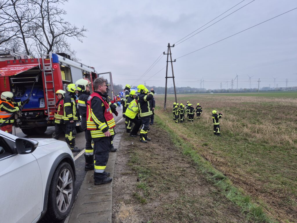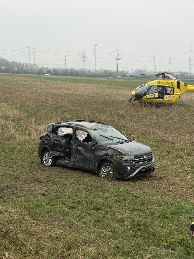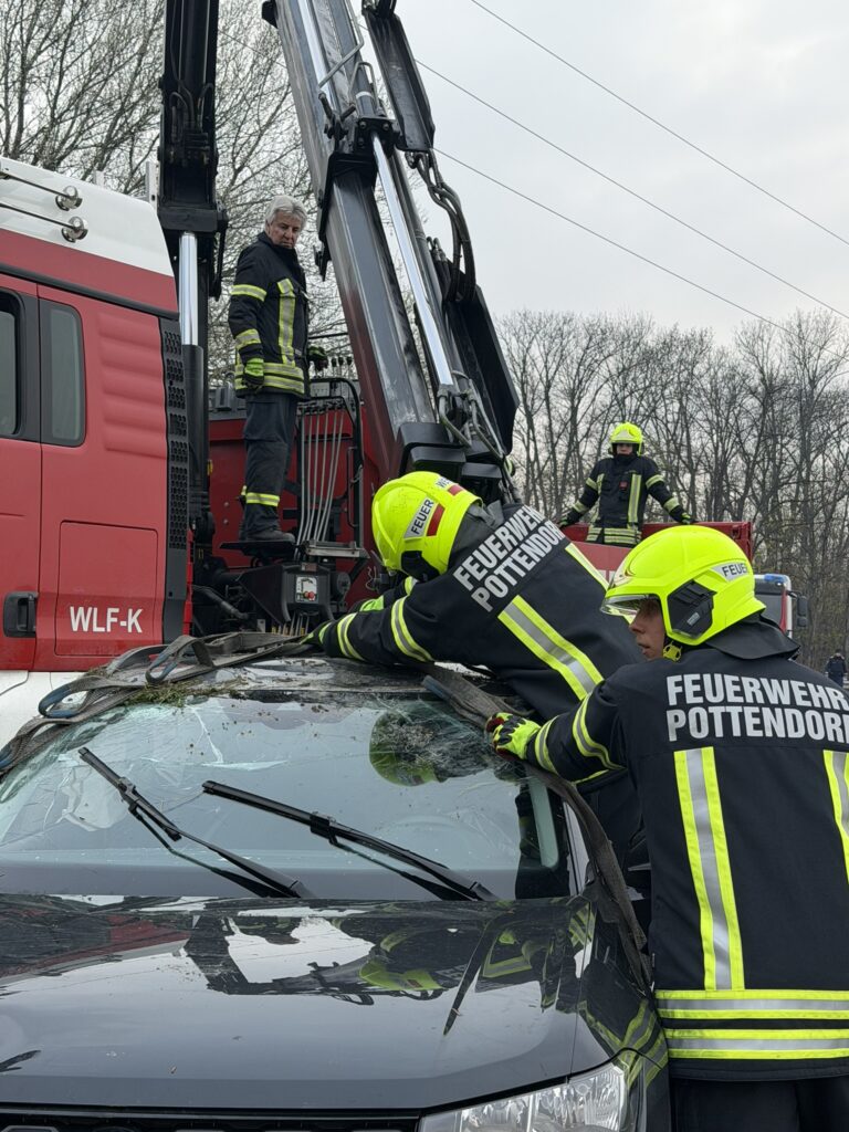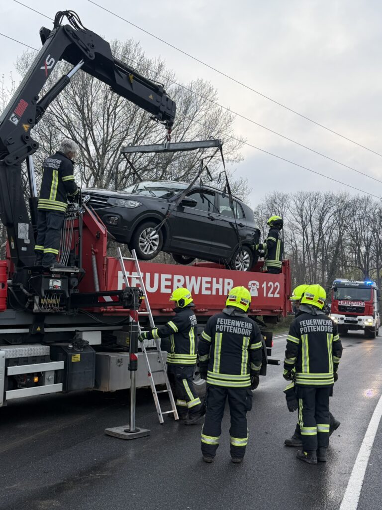 Einer der beteiligten PKW kam im angrenzenden Feld zum Stillstand. Dieser wurde mittels Seilwinde geborgen und anschließend mit dem Ladekran an einem geeigneten Ort sicher abgestellt.